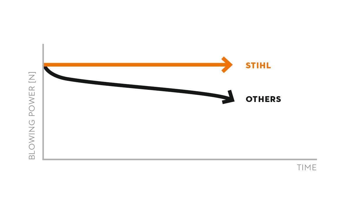 FOLYAMATOS TELJESÍTMÉNY AZ AKKUMULÁTOR TÖLTÖTTSÉGI ÁLLAPOTÁTÓL FÜGGETLENÜL. Az akkumulátoros gépek teljesítménye az akkumulátor lemerülésével használat közben csökken. A folyamatos teljesítményt leadó STIHL akkumulátoros gépek az intelligens elektronikának köszönhetően állandóan magas teljesítményszinten működnek.